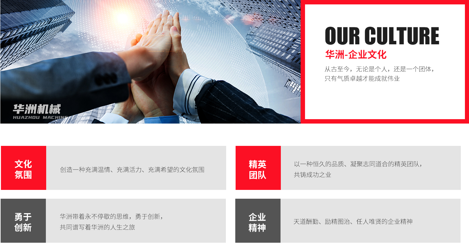 一個企業(yè),只有創(chuàng)造一種充滿溫情、充滿活力、充滿希望的文化氛圍,才能散發(fā)出獨特的性格魅力, 以一種恒久的品質(zhì)、凝聚志同道合的精英團隊,共鑄成功之業(yè)。 華洲帶著永不停歇的思維,勇于創(chuàng)新,共同譜寫著華洲的人生之旅。天道酬勤、勵精圖治、任人唯賢的企業(yè)精神,創(chuàng)造學習型組織,用激情演繹精良,用勤奮推動機械事業(yè)的迅速發(fā)展。